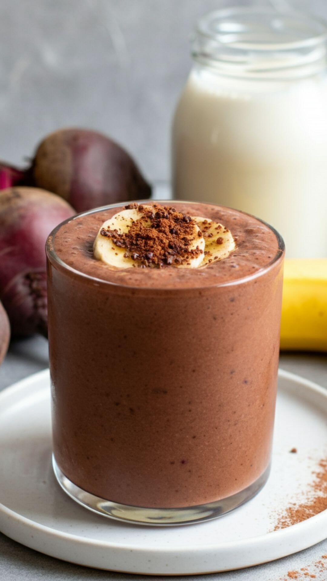 A vibrant and appetizing smoothie in a clear glass, showcasing a rich chocolatey-brown color with subtle hints of red from beetroot. Garnish the smoothie with a sprinkle of cocoa powder and a slice of banana on top. The background features fresh ingredients: a whole beetroot, a scoop of chocolate protein powder, a banana, a small jar of almond milk, and a spoonful of cocoa powder, all arranged neatly on a white dish. The scene is well-lit with natural light,
