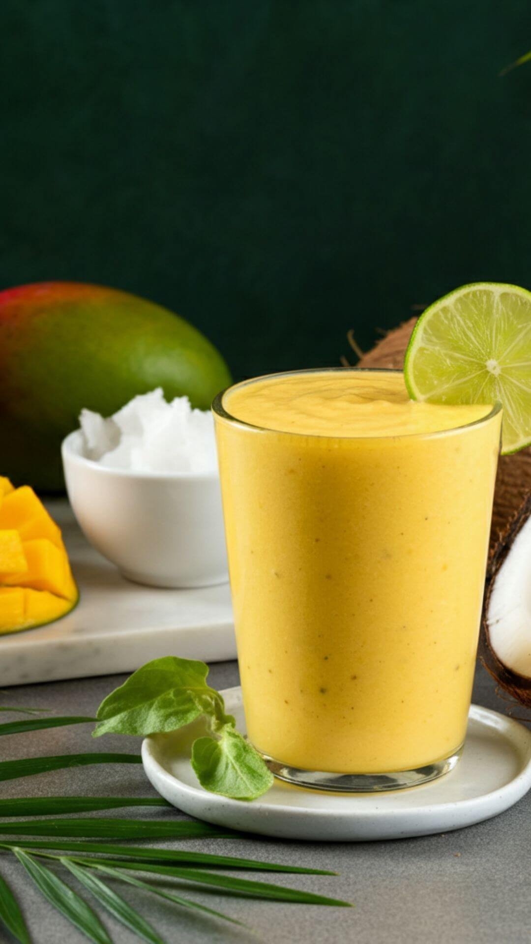 A vibrant, sunny smoothie in a clear glass, garnished with a lime slice and tropical leaves in the background. The smoothie has a golden yellow hue, with visible frothy texture on top. Surrounding the glass are fresh mango slices, pineapple chunks, a halved coconut, and a small bowl of coconut oil, all placed on a white diah. The scene evokes a tropical, refreshing vibe with soft natural lighting.